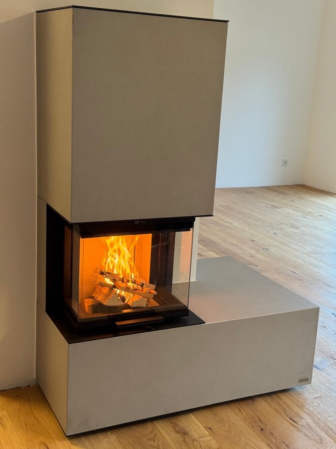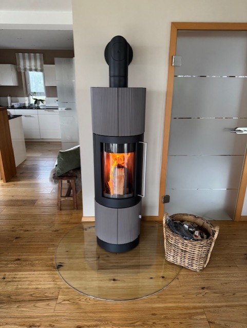 Kaminofen Skantherm Emotion M mit individuell gefertigter Vorlegeplatte